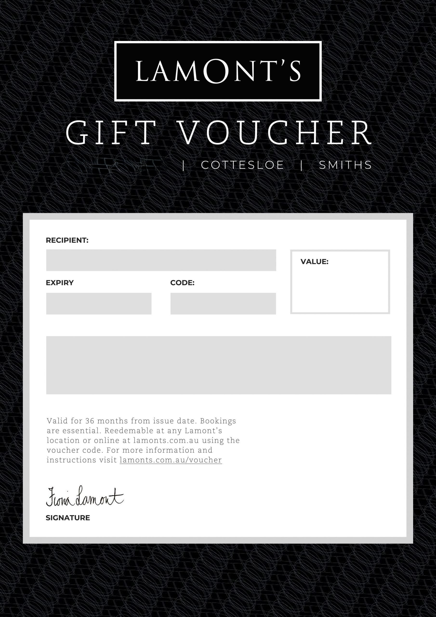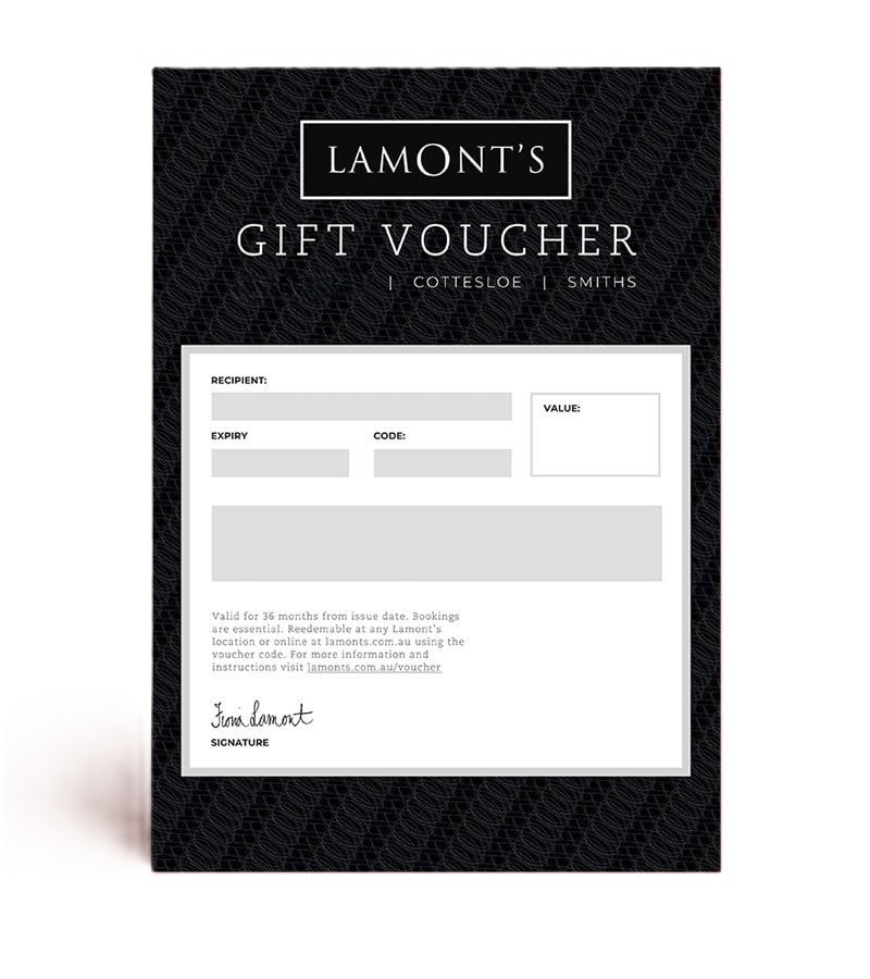 Give the gift of Lamont’s! Our electronic gift vouchers are sent instantly to a recipient as a printable PDF via e-mail. Vouchers can be used at Lamont’s Cottesloe Wine Store and Lamont’s Smiths Beach on food and wine, or on website wine and products within 36 months of purchase.